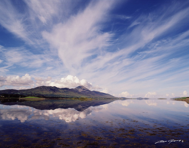Croagh Patrick is surounded by wonderful cloud arrangements mirrored in Clew Bay.
